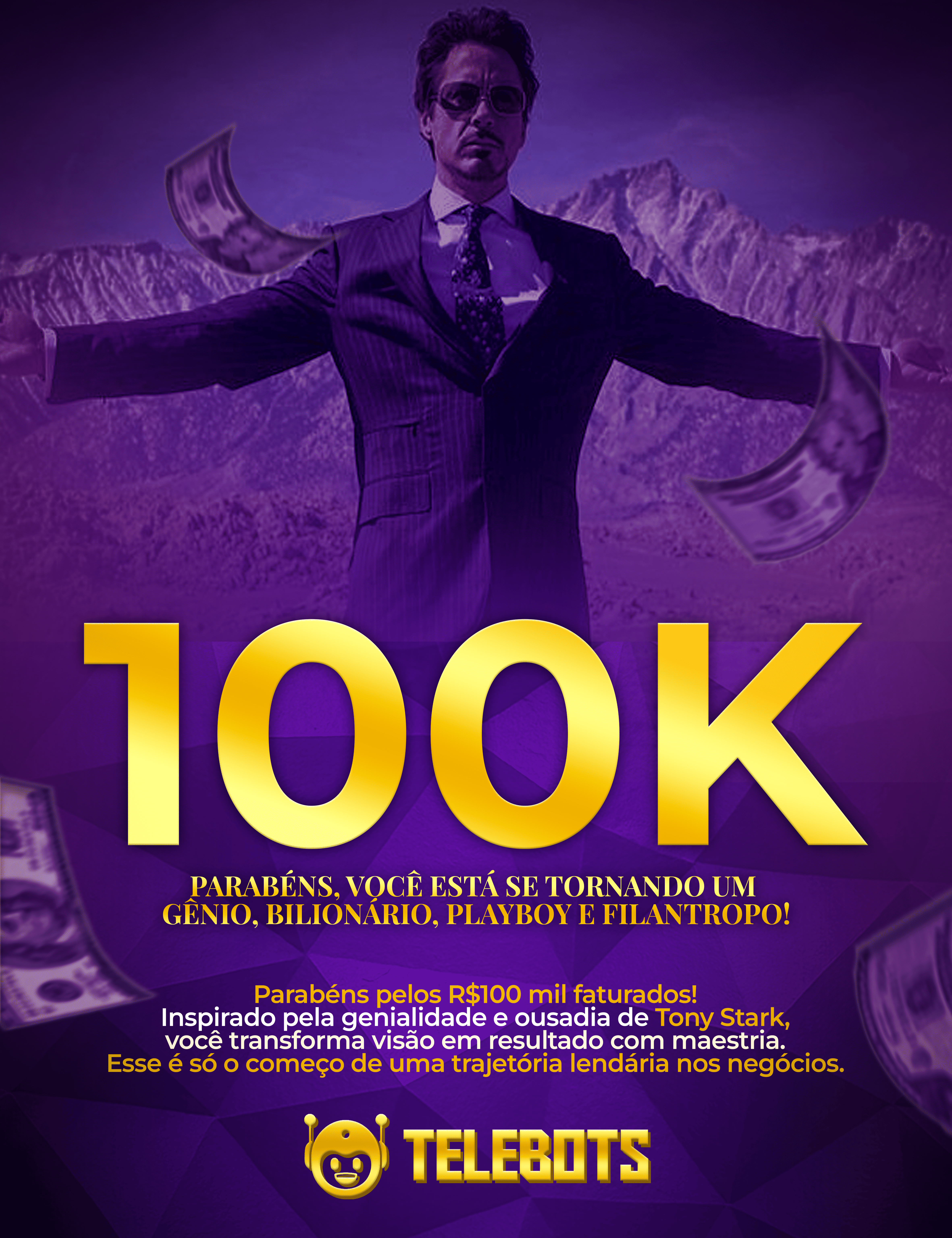 Parabéns pelos R$100 mil faturados! Inspirado pela genialidade e ousadia de Tony Stark, você transforma visão em resultado com maestria. Esse é só o começo de uma trajetória lendária nos negócios.