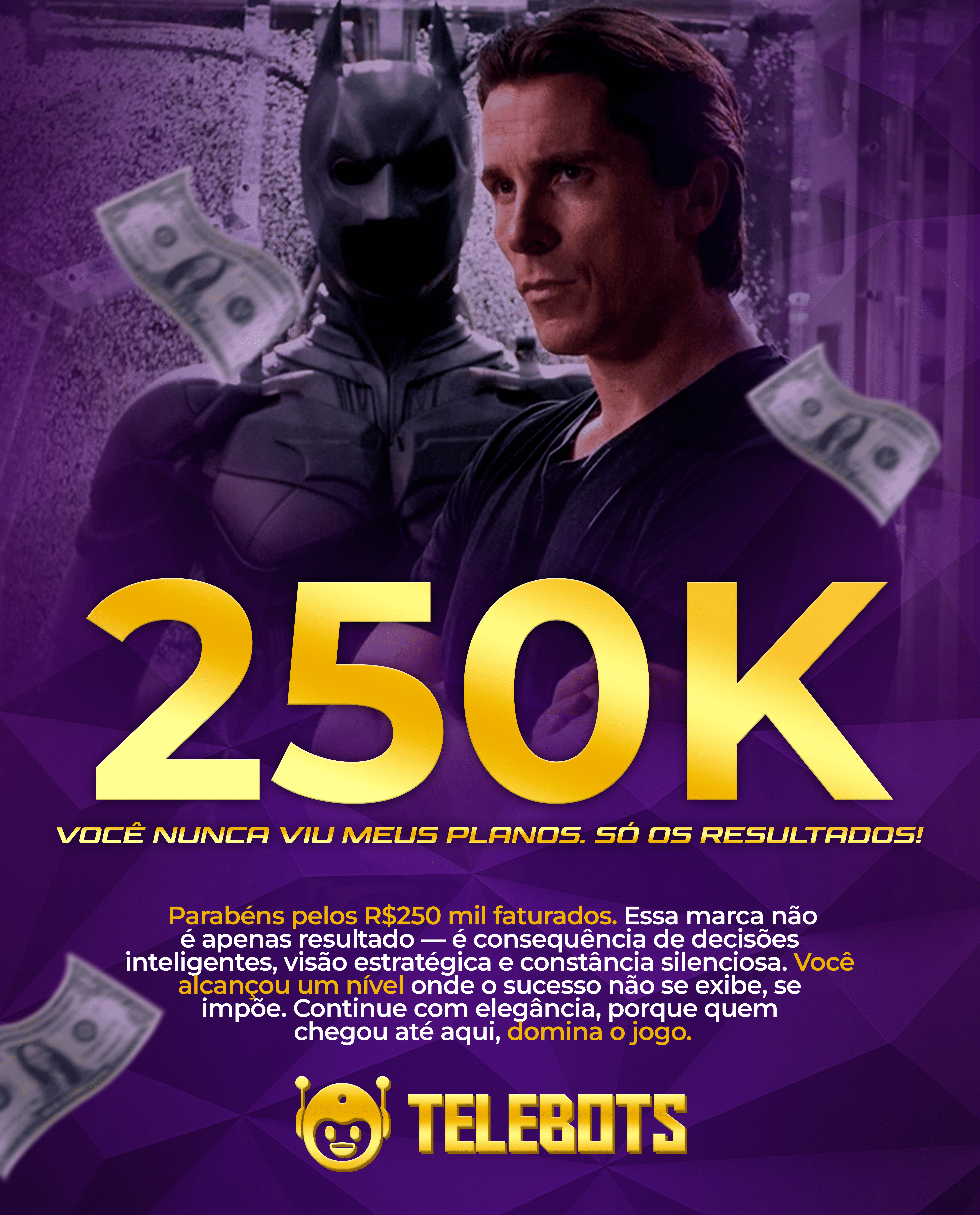 Parabéns pelos R$250 mil faturados. Essa marca não é apenas resultado - é consequência de decisões inteligentes, visão estratégica e constância silenciosa. Você alcançou um nível onde o sucesso não se exibe, se impõe. Continue com elegância, porque quem chegou até aqui, domina o jogo.