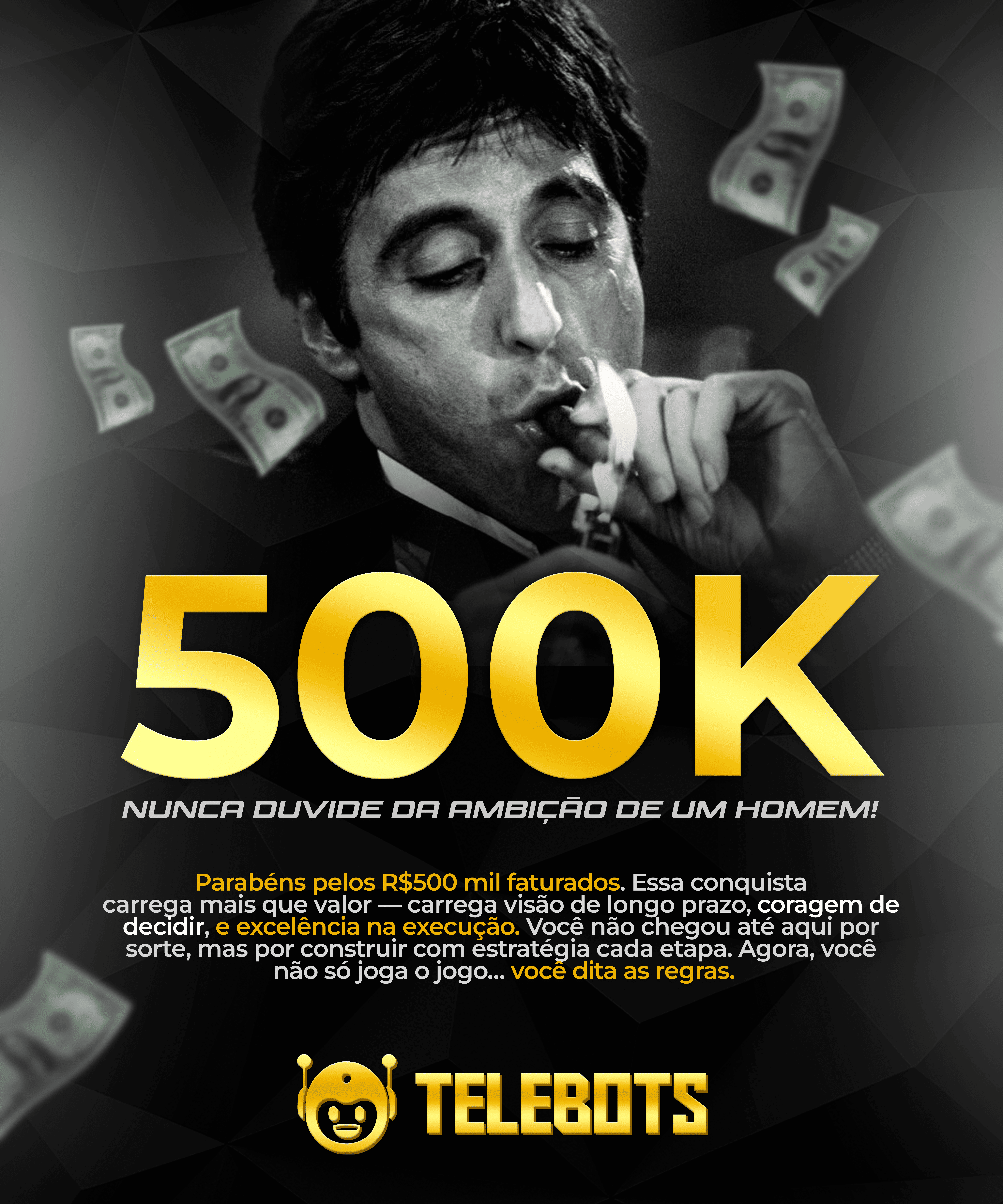 Parabéns pelos R$500 mil faturados. Essa conquista carrega mais que valor - carrega visão de longo prazo, coragem de decidir, e excelência na execução. Você não chegou até aqui por sorte, mas por construir com estratégia cada etapa. Agora, você não só joga o jogo... voce dita as regras.